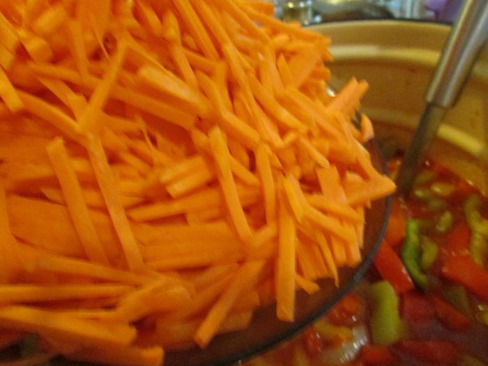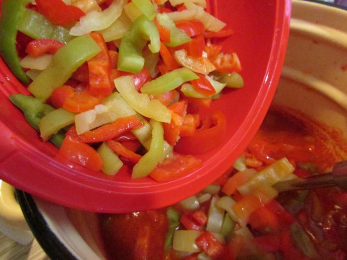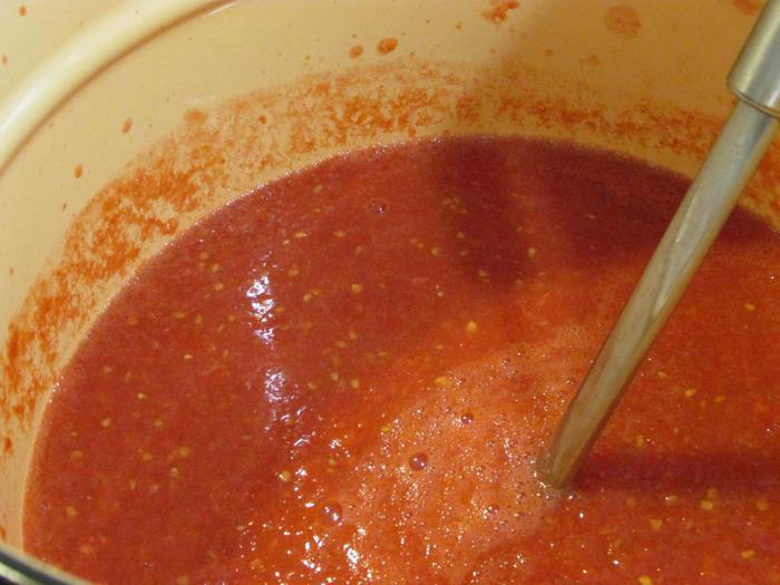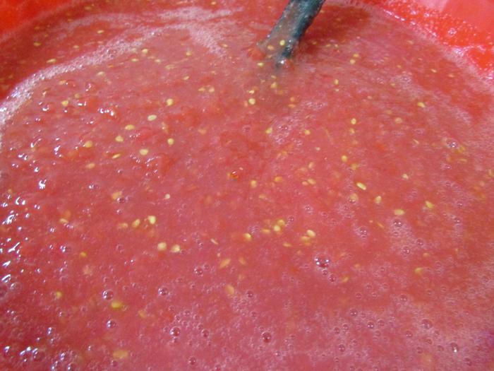 Помидорную массу, вылить в емкость, поставить на огонь и кипятить 10 минут. Затем добавить 1 стакан сахарного песка (я люблю послаще, поэтому кладу 2 стакана), 2 ст. л. соли, 1 стакан растительного масла, кипятить еще 15 минут. Затем добавить столовый уксус. Массе дать чуть-чуть покипеть.