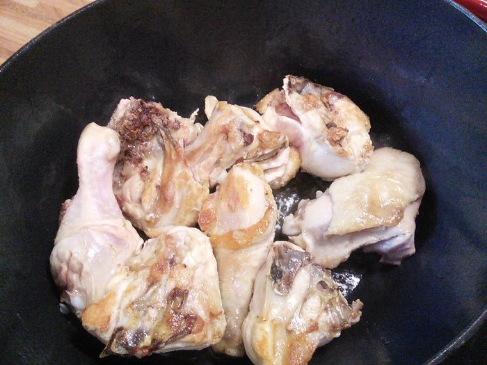 В жаровне разогреть масло, обжарить курицу до золотистого цвета, извлечь и отложить в сторону. В том же масле пассеровать лук и чеснок. Разогреть духовку до 190 °.