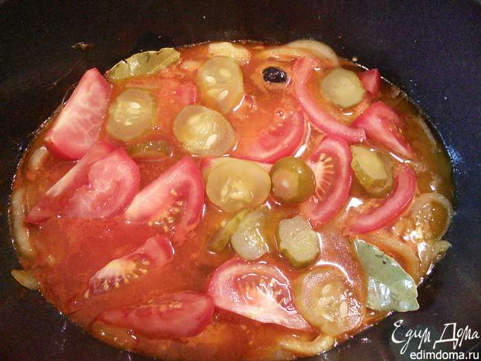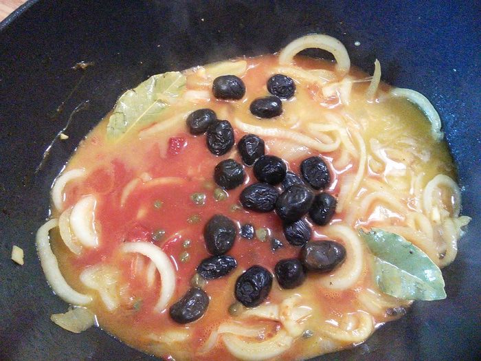 Влить вино, добавить лавровый лист, каперсы и маслины. Довести до кипения. Добавить томатную пасту, сок и бульон, довести до кипения, уменьшить огонь и проварить 5 мин.
