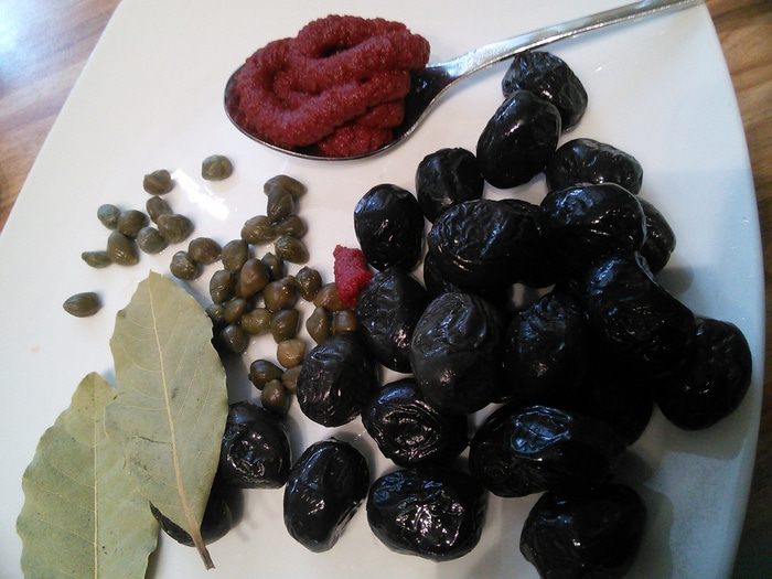 Слить рассол с каперсов и маслин (они должны быть желательно с косточками).