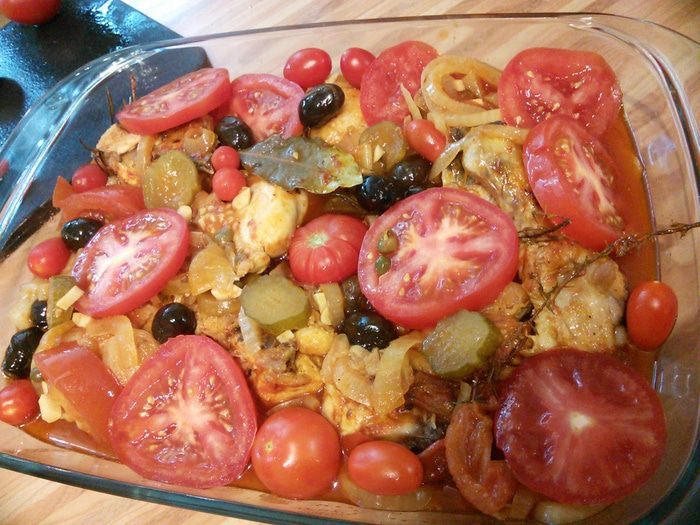 Добавить помидоры (все), у меня под рукой оказался солёный огурчик, я его тоже нарезала и положила в соус. Посолить, поперчить и выложить курицу, добавить тимьян, розмарин и черри. Запекать примерно 45 минут.
