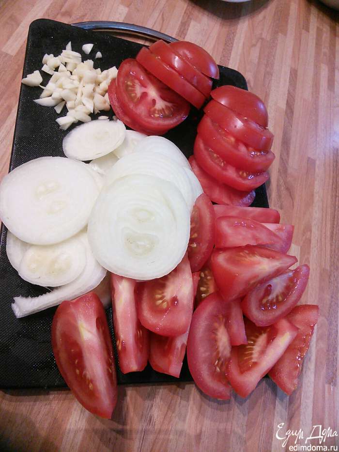 Помидоры разделить на половину, одну половину нарезать толстыми кружочками, другую на четвертинки. Лук (у меня белый) порезать кружочками, чеснок порубить.