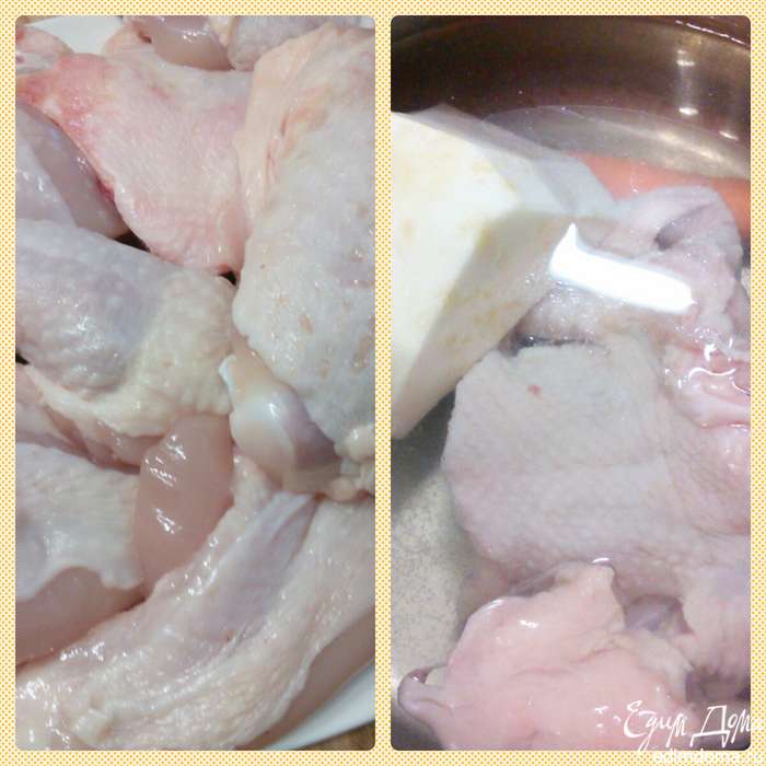 Курицу разделать на порционные кусочки. Помыть, обсушить, из менее мясистых частей сварить бульон.