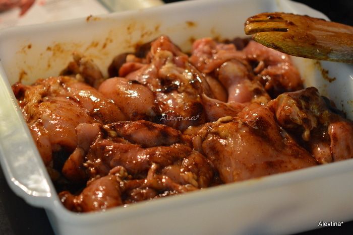 Выложить в маринад куриные грудки, у меня куриные бедрышки без кости. Оставить на 15 мин мариноваться.