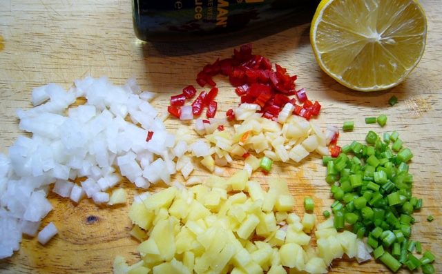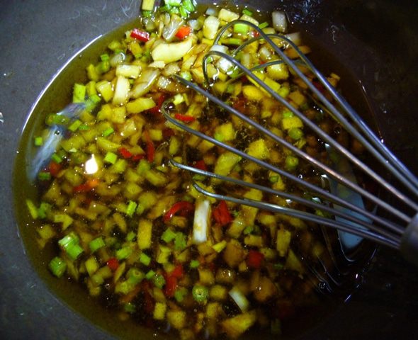 Приготовим соус заранее. Имбирь очистить, измельчить. Шалот и чеснок мелко нарезать. Перец чили освободить от семян, мелко нарезать. У кинзы потребуются только стебли, измельчить. Из лимона выжать сок.