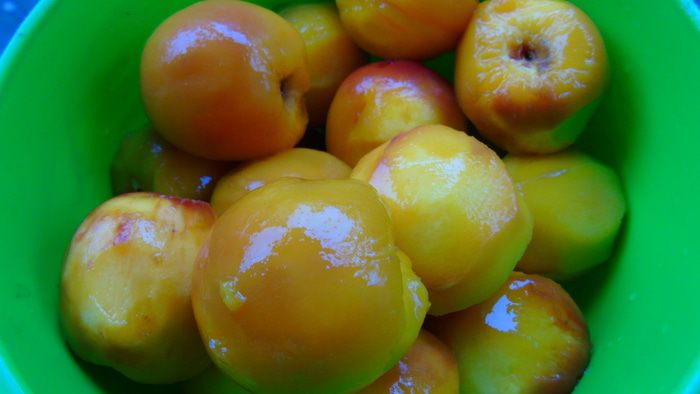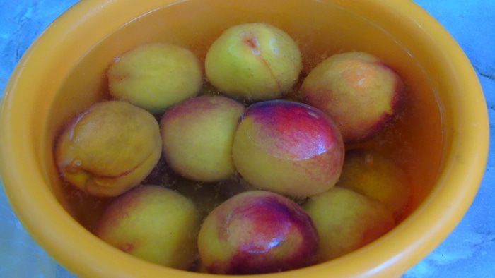 Персики помыть, залить кипятком и сразу же отправить в холодную воду.