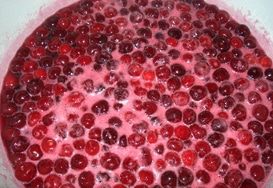 Сахар должен увариться, добавляем вишню и осторожно помешиваем, чтобы вишни не подгорали.