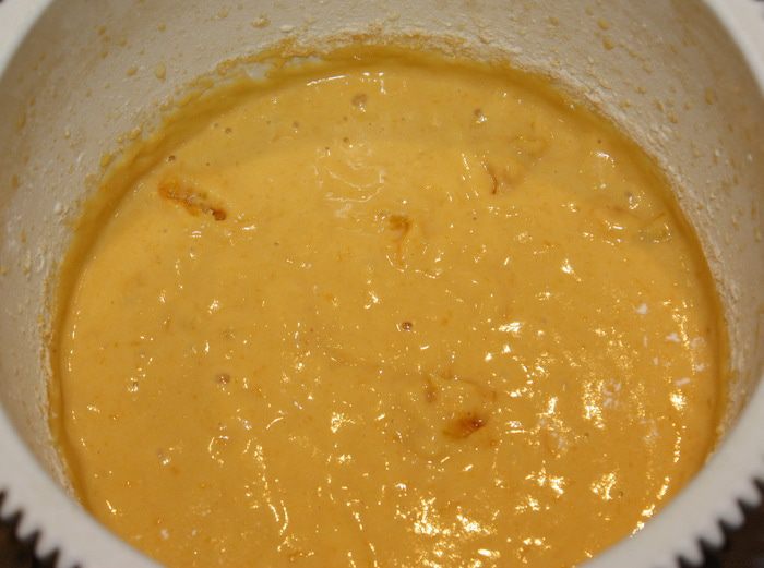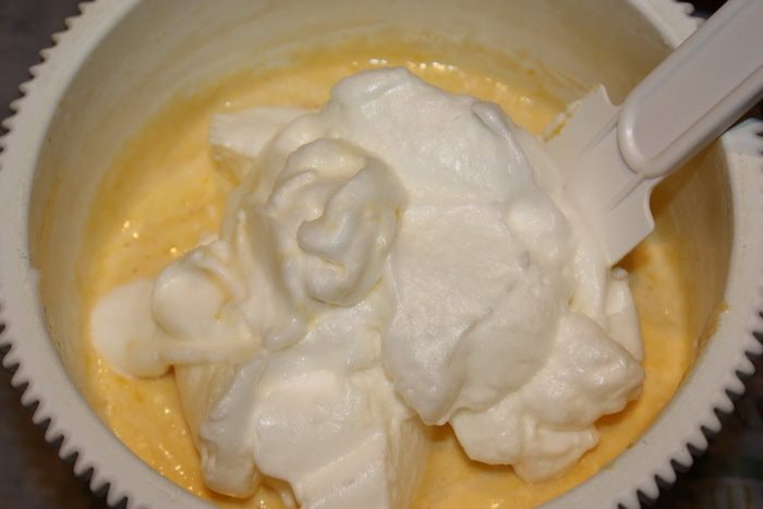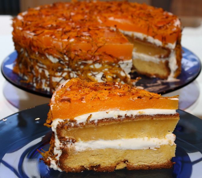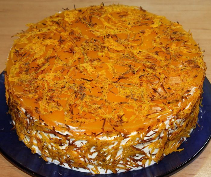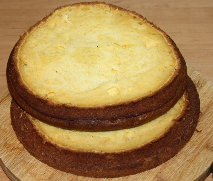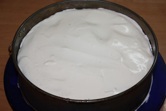 Крем. Сметану процеживаем около 2,5 – 3 часов, чтобы избавиться от ненужной влаги. Взбиваем ее с сахарной пудрой на высокой скорости около 7 минут. У крема должна получиться однородная структура, чем-то напоминающая меренгу перед выпечкой. Корж выкладываем на блюдо и надеваем на него кольцо. Смазываем кремом, затем второй корж и опять крем. Ставим в холодильник.