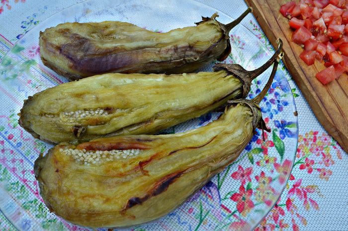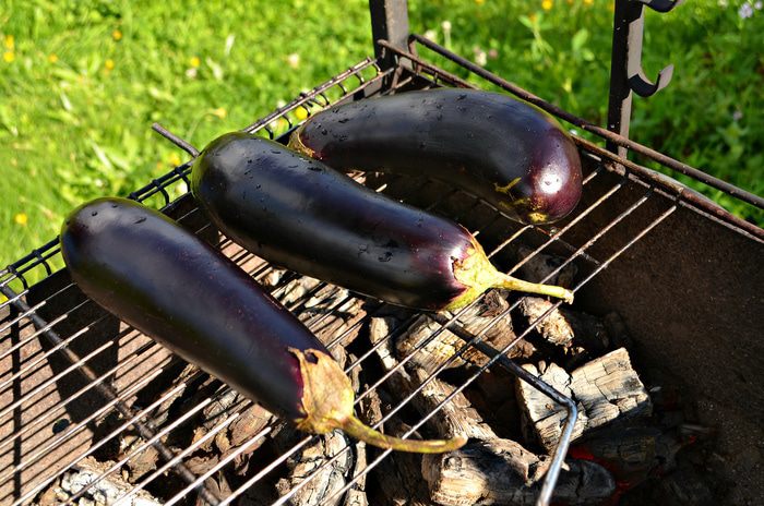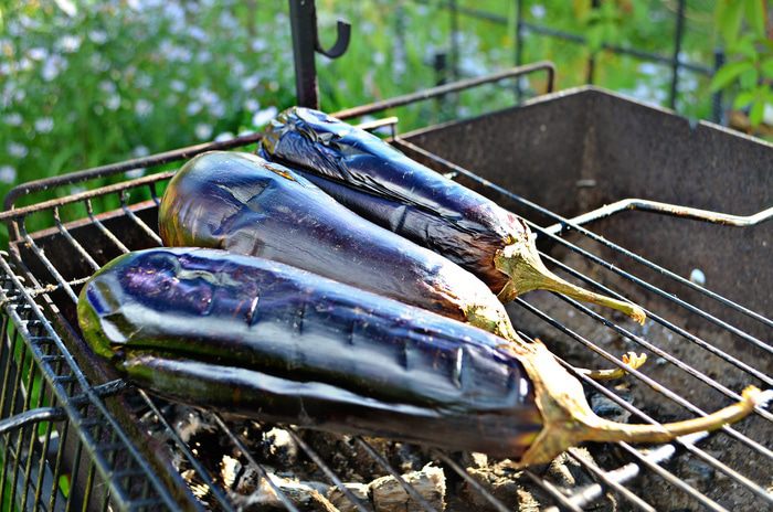 Запечь баклажаны на гриле (около 15 мин), периодически поворачивая овощи для равномерного запекания.