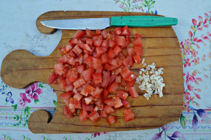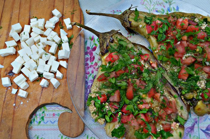 На баклажаны выложить чеснок, помидоры, рубленную зелень и нарезанную кубиками фету. Вместо феты можно использовать брынзу или адыгейский сыр, также вы можете не нарезать кубиками, а покрошить поверх помидоров.