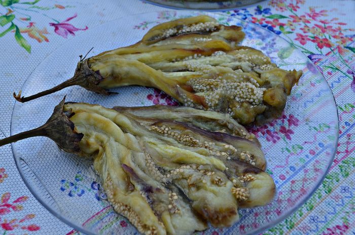 Готовые баклажаны снять с решётки гриля, дать слегка остыть. Можно на 10 мин положить под пресс, чтобы стекла горечь. Но с молодыми баклажанами я не стала этого делать.