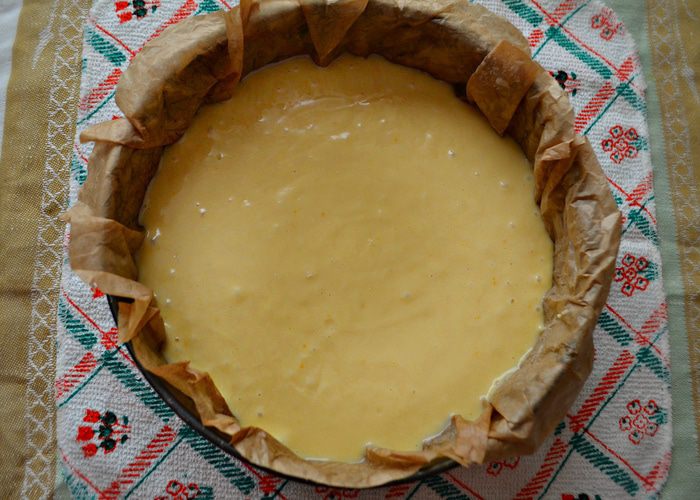 Форму для выпечки (d=24 см) смажьте маслом и присыпьте мукой либо выстелите пекарской бумагой (как у меня). Я предварительно смачиваю бумагу водой и хорошо выжимаю, а затем выкладываю в форму. Так она лучше прилегает к стенкам формы. Затем смажьте слега бумагу маслом и выложите подготовленное тесто.
