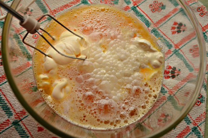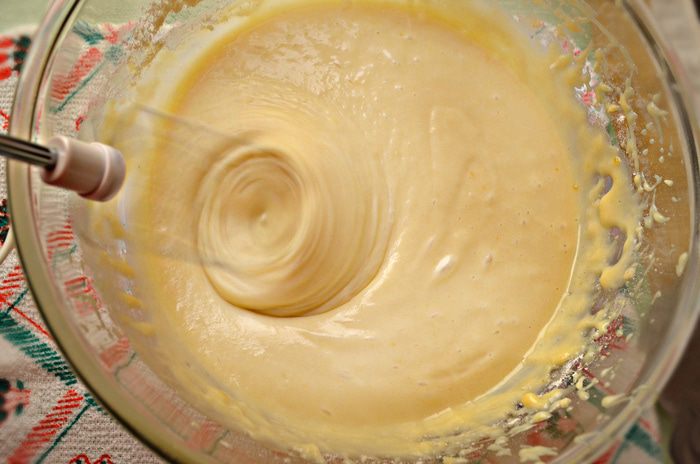 Затем порциями добавлять муку и взбить немного миксером. Консистенция теста должна быть как на оладьи.