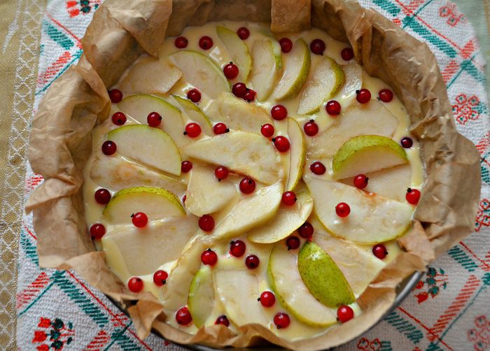 Сверху уложите груши и посыпьте ягодами красной смородины.