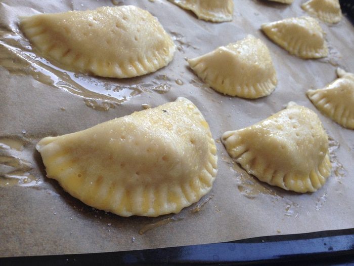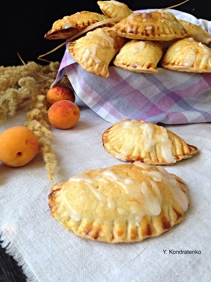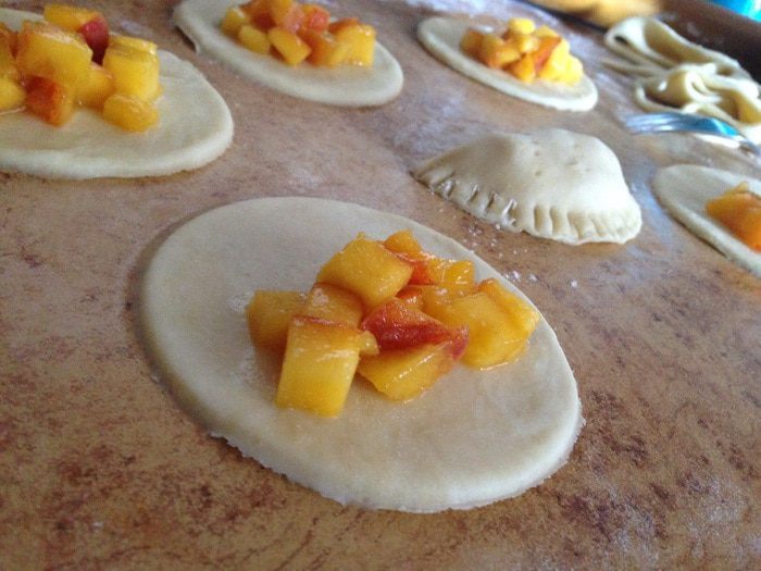 Тесто вынуть из холодильника, разделить на две части и раскатать в пласт толщиной 5мм. Вырезать формой кружочки. С одной стороны положить начинку из персиков, сформировать пирожок. Сначала края хорошо прижать пальцем, а затем по краю пройтись вилкой.