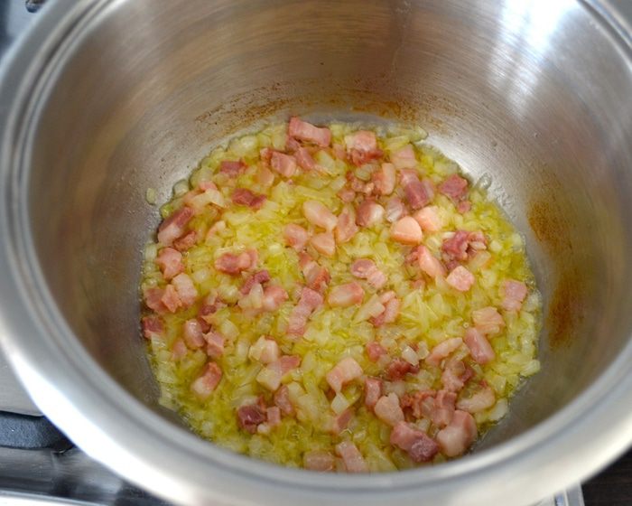 В кастрюле разогрейте сливочное масло и обжарьте на нем минуты 3-4 лук с беконом.