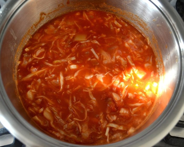 Положить капусту в суп и варить еще 10 минут. Посолить и поперчить по вкусу.