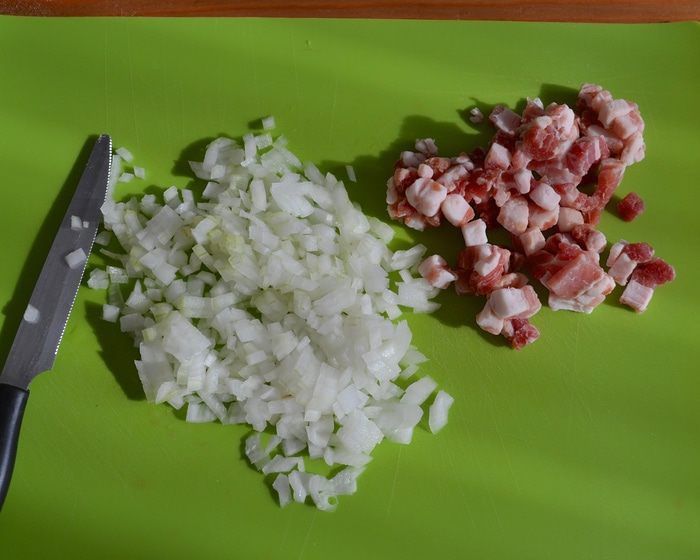 Бекон нарежьте небольшими кубиками. Лук очистите и нарежьте помельче. Картошку почистите и также нарежьте небольшими кубиками.