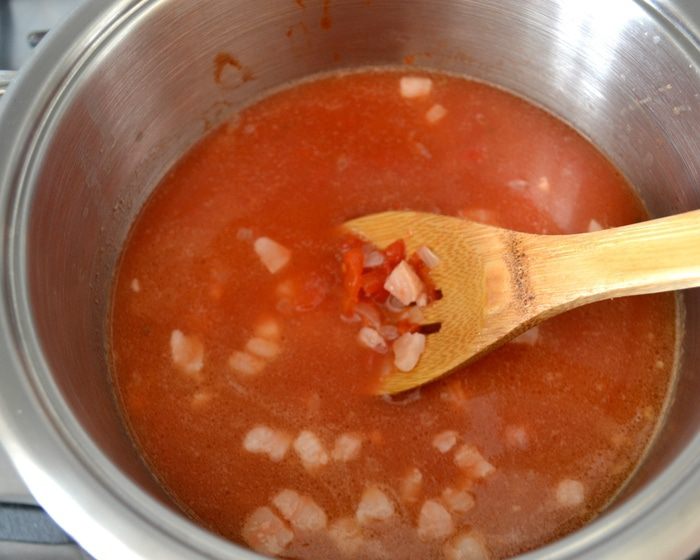 Добавьте в кастрюлю картофель и обжаривайте все еще пару минут. Затем положить помидоры в собственном соку и бульон. Варить все около 15-20 минут или до готовности картофеля.