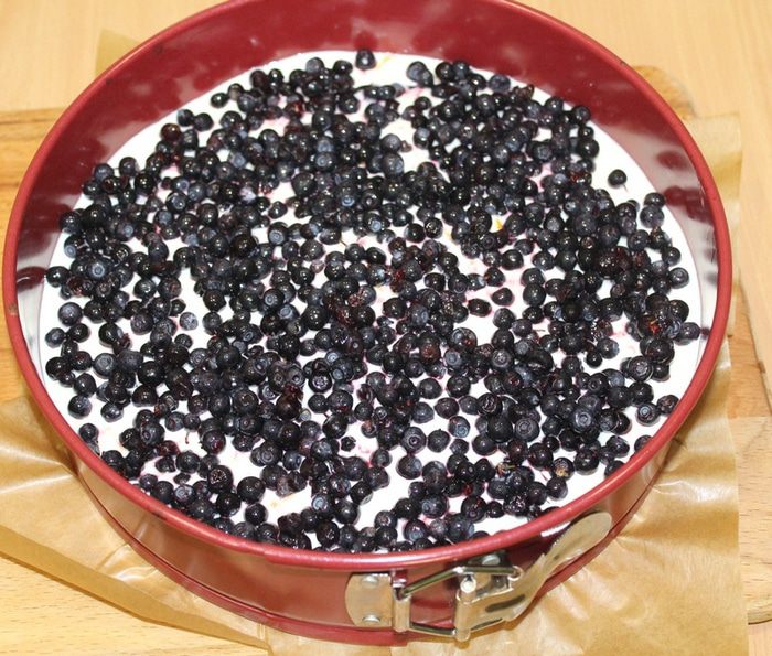 Выложите сырную массу на полувыпеченное тесто и сверху положите чернику. Снова поставьте в духовку на 30-35 минут при 180С.