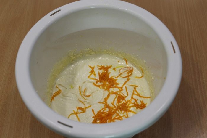 Взбейте жирные сливки. В отдельной миске взбейте до однородной массы сахар, цедру и сок апельсина, манную крупу и сыр. Затем введите взбитые сливки.