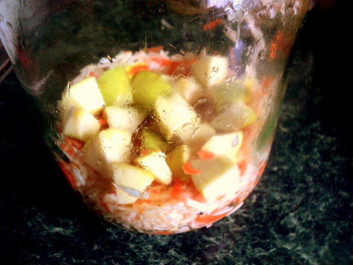 Капусту тонко нашинковать ножом или на специальной терке. Добавить к капусте морковь, соль, сахар и хорошо перетереть руками, чтобы капуста пустила сок.