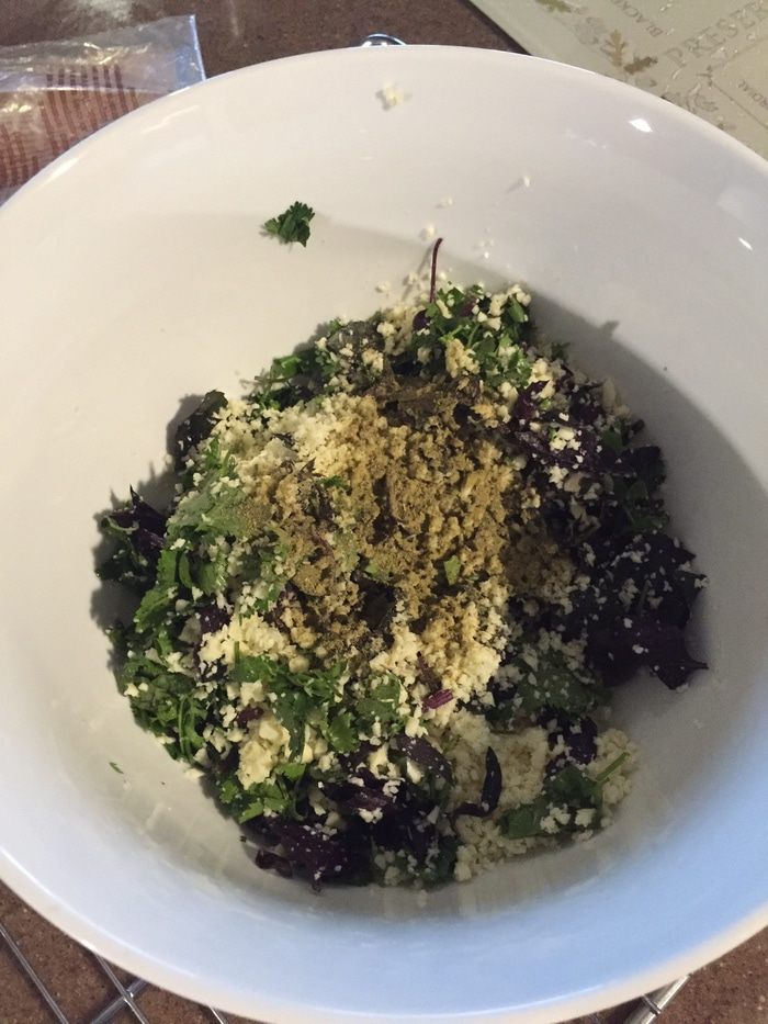 Перемалываем сулугуни с зеленью и хмели-сунели.