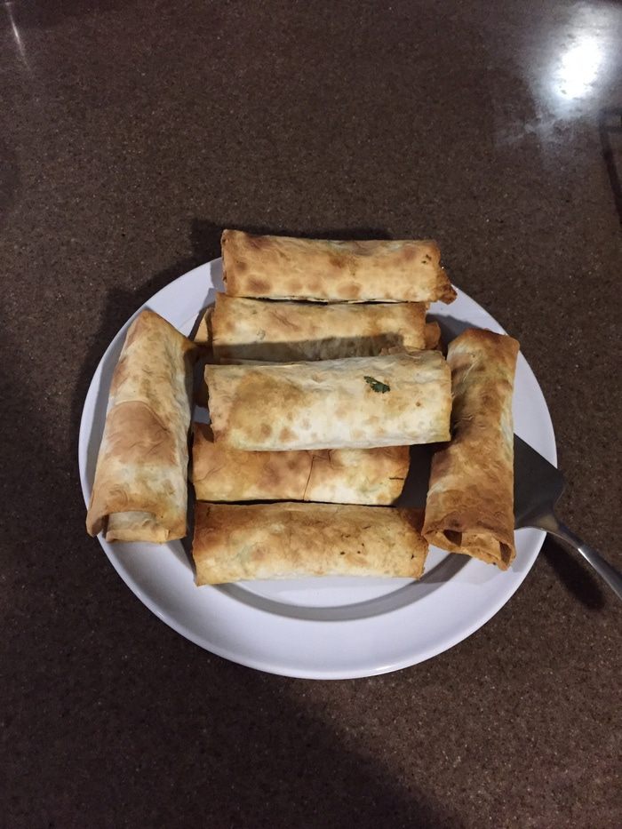 Выкладываем сырную смесь на лаваш и заворачиваем рулетики. Кладем их на решетку.