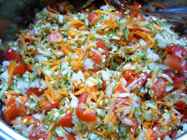 Огурцы и морковь натереть на крупной терке.