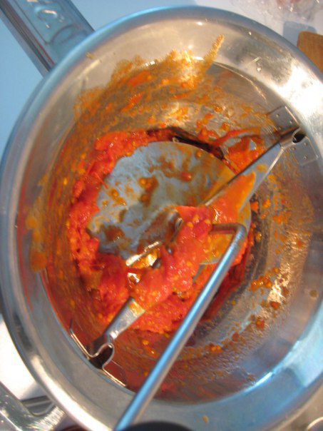 Я встречала рецепты соуса, где предварительно обдают кипятком помидоры, удаляют кожицу и семена и только после этого готовят.Но если сициийская синьора будет весь свой огромный урожай очищать, то так и за две недели не управиться и все помидоры сгниют. Поэтому готовят неочищенные помидоры, а вот затем их протирают, тем самым удаляют кожицу и семена.