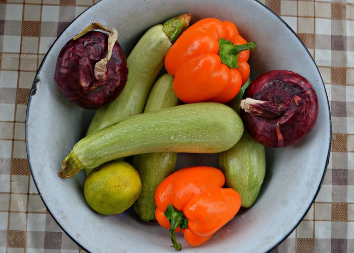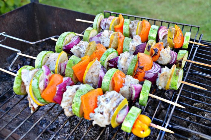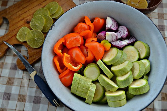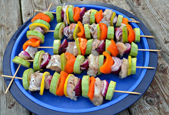 Нанизывайте кубики рыбы вперемежку с кусочками лимона, лайма, перца, кабачка и четвертинками лука на предварительно вымоченные в воде