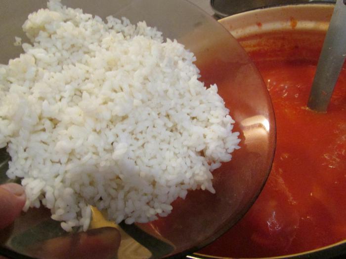 Затем добавить рис, сахар и столовый уксус. Варить еще 20 минут, помешивая.