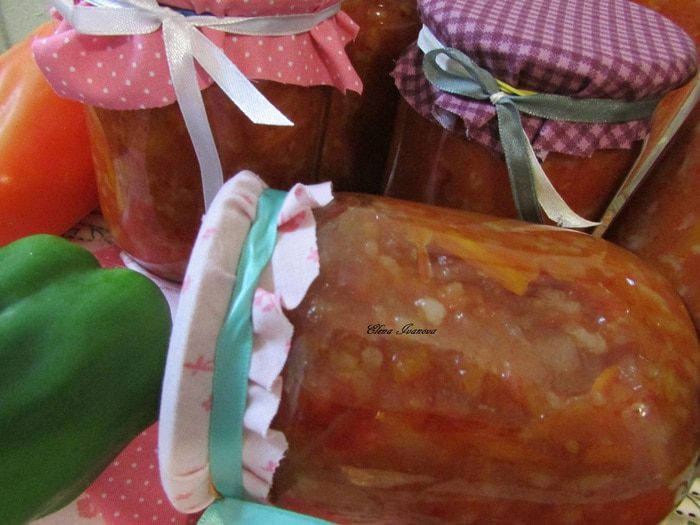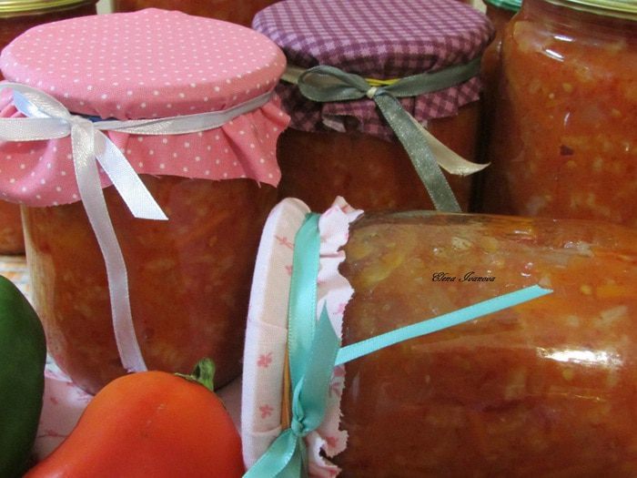 Салат горячим разложить по стерилизованным банкам, закатать под ключ. Я готовила сразу две порции. Выход: 5 баночек по 700 г и 6 баночек по 500 г.
