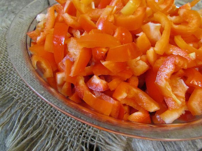 Болгарский перец (желательно красный) помыть освободить от семян и плодоножки. Порезать соломкой.