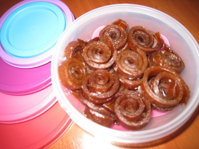 Потом, если есть сушка, досушиваем на ней. Если нет, то на балконе на солнце, но, обязательно, с доступом свежего воздуха (или на улице, если это дача). Перекладываем вместе с пергаментом на поднос сушки и сушим в течении 12 часов. В результате должна получиться плотная, упругая и сухая консистенция.