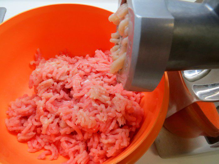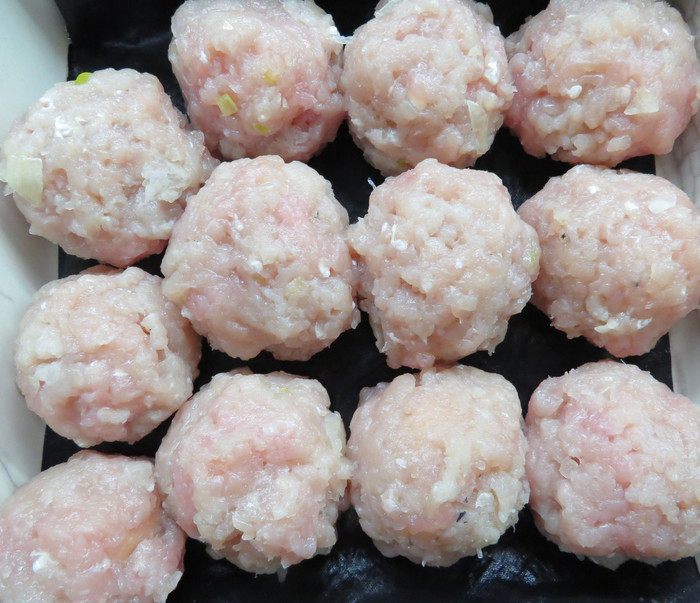 Готовим тефтели. Филе и лук пропустить через мясорубку, посолить, поперчить, хорошо перемешать.