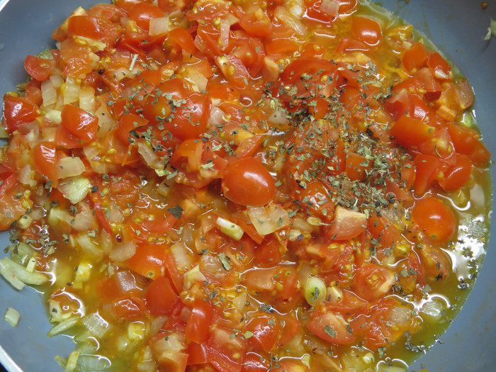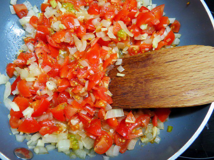 На растительном масле обжарить лук и чеснок, добавить помидоры и тушить в течение 3–4 минут.