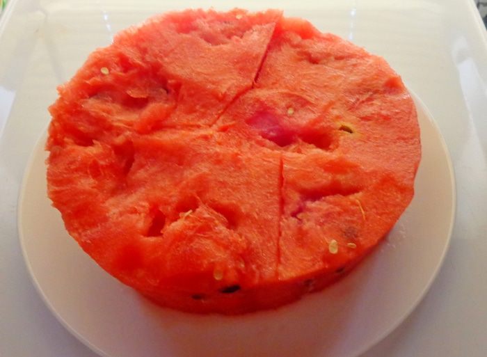 Из арбуза вырезать пласт мякоти требуемого размера.