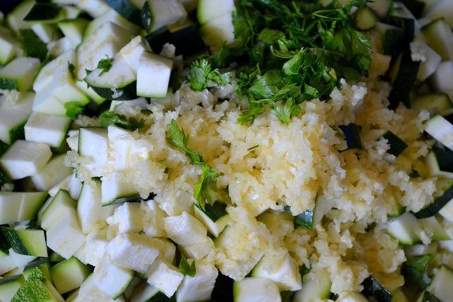 Добавляем к ним чеснок и рубленую зелень. У меня - петрушка, кориандр, укроп.