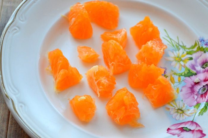 Очищаем от перегородок и нарезаем кусочками мандарины.