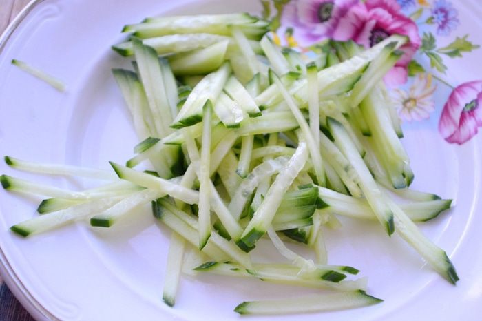 Тонкой соломкой нарезаем огурец.