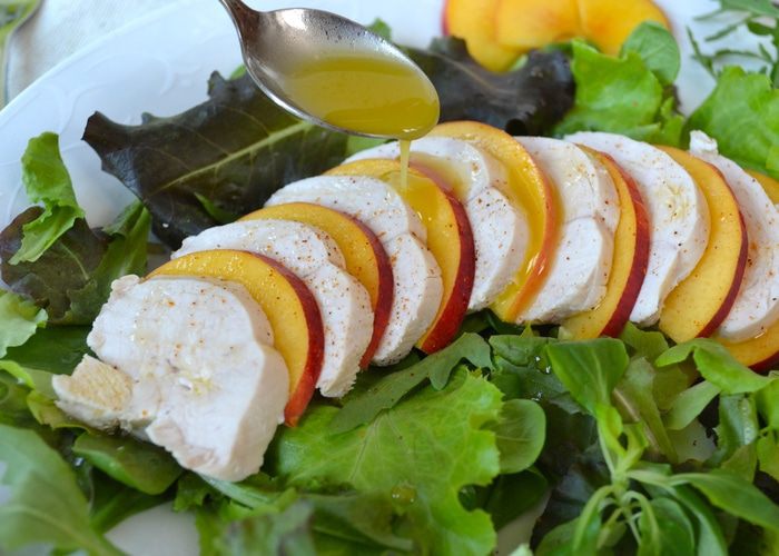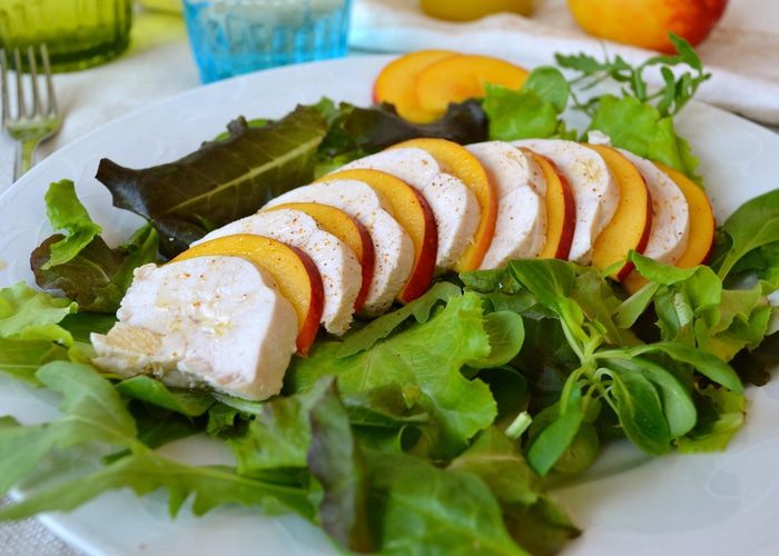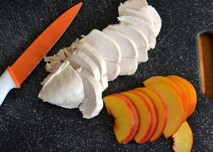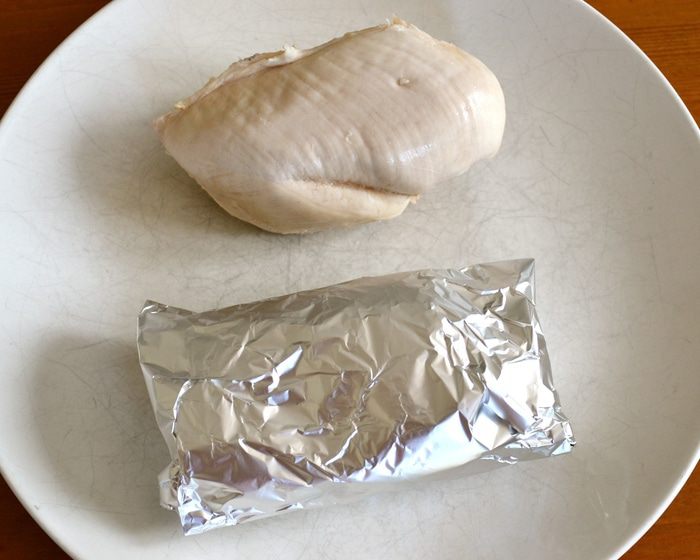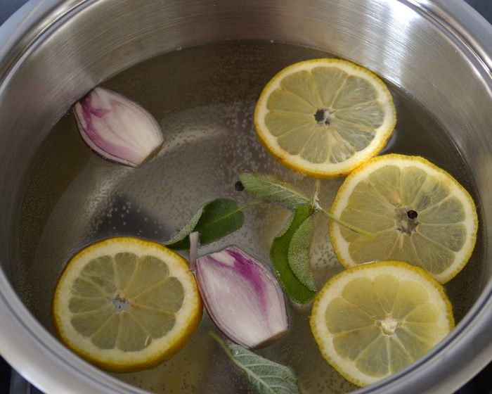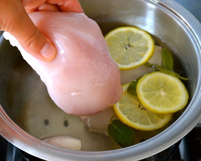 Первым делом отварить куриную грудку. Для этого поставить закипать кастрюлю с водой. Лимон как следует вымыть. Половину лимона нарезать дольками и положить в воду. Лук-шалот очистить и, разрезав пополам, также положить в кастрюлю с водой. Добавить листья шалфея, горошины черного перца и белое вино. Дать воде закипеть.