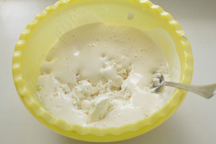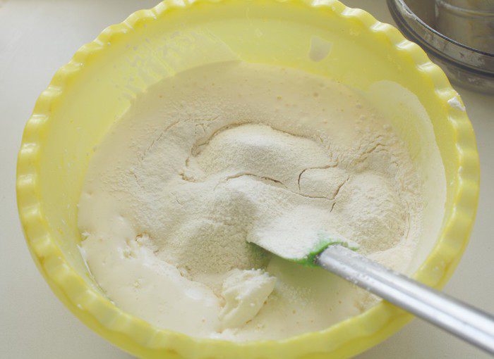 Муку с разрыхлителем, тщательно перемешайте силиконовой лопаткой.