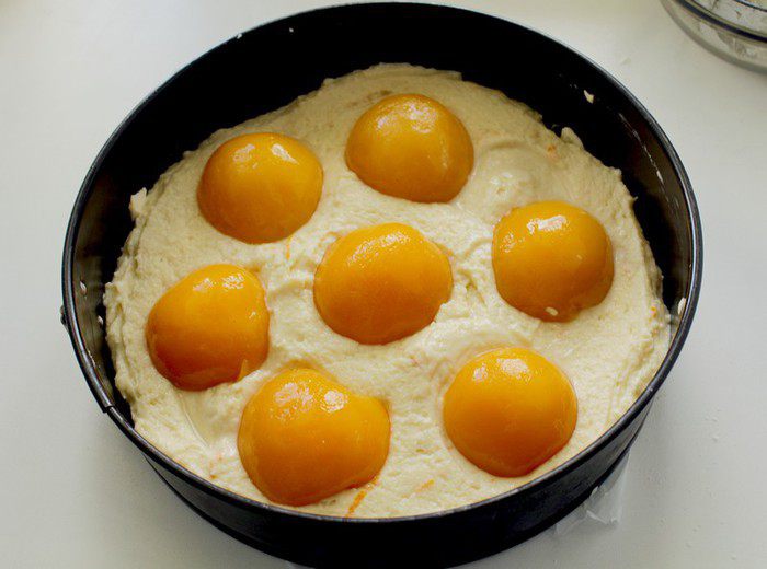 Распределите тесто по форме, разровняйте, сверху разложите половинки персиков, слегка вдавливая их в тесто.