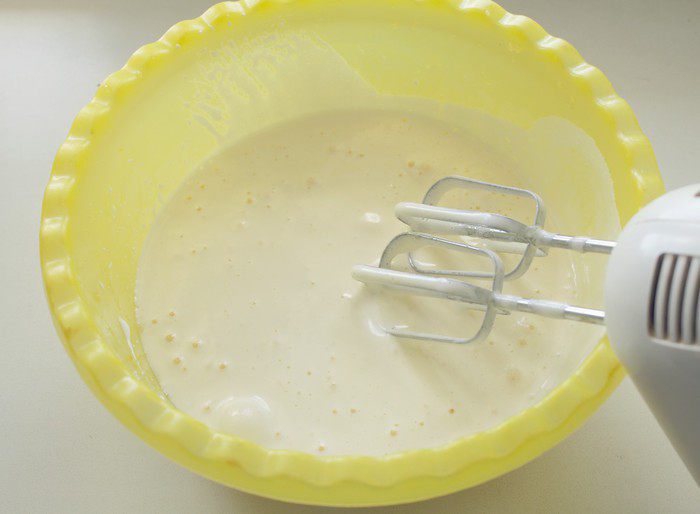 В отдельную миску разбейте яйца, всыпьте сахар и взбейте при помощи миксера, работающего на высокой скорости, в пышную светлую пену.