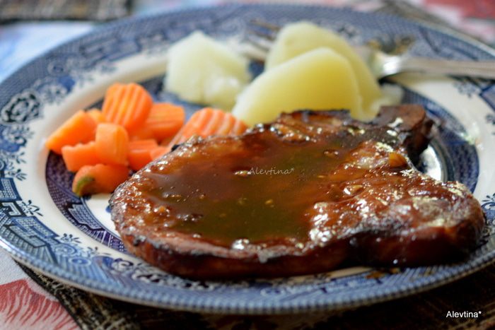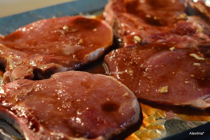 Готовим свиные отбивные после маринования на разогретом гриле или в духовке на противне (200С 40 мин.)
