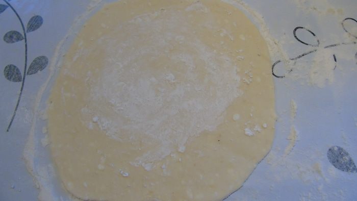 Рабочую поверхность хорошо присыпать мукой, выложить тесто и разделить его на 4 части. Каждую часть раскатать в круг и чуть присыпать крахмалом, не доходя до края.
