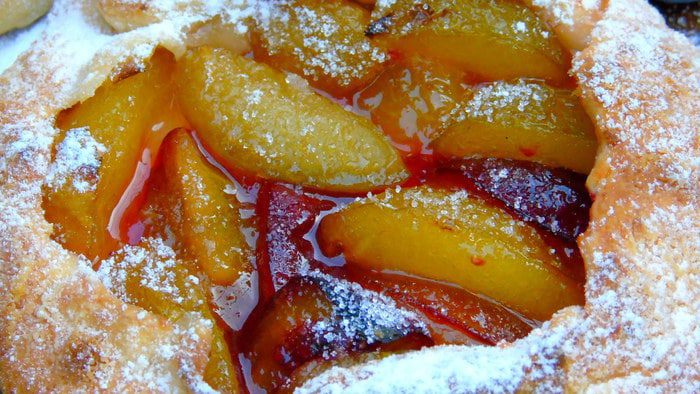 Пока тесто охлаждается, приготовим начинку. Сливы вымоем, вынем косточку и нарежем на четвертинки. Добавить малину (у меня мороженная). Присыпать сахаром.