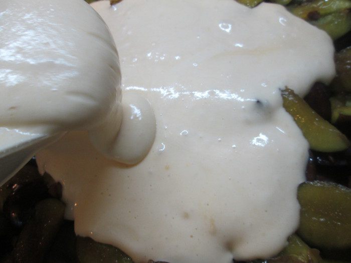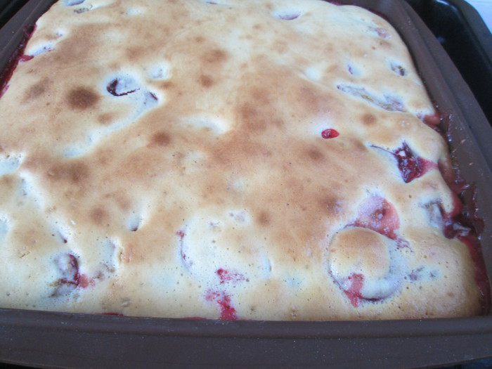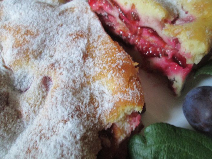 Взбиваем сметану для пышности и аккуратно, движениями внизу вверх, соединяем ее с тестом. Выкладываем сливы на смазанную маслом и посыпанную сухарям форму, а сверху на сливы выливаем тесто.