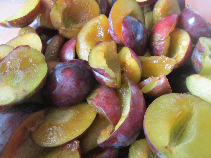 Сливы разрежьте на половинки, удалив косточки и сбрызните коньяком или ромом.